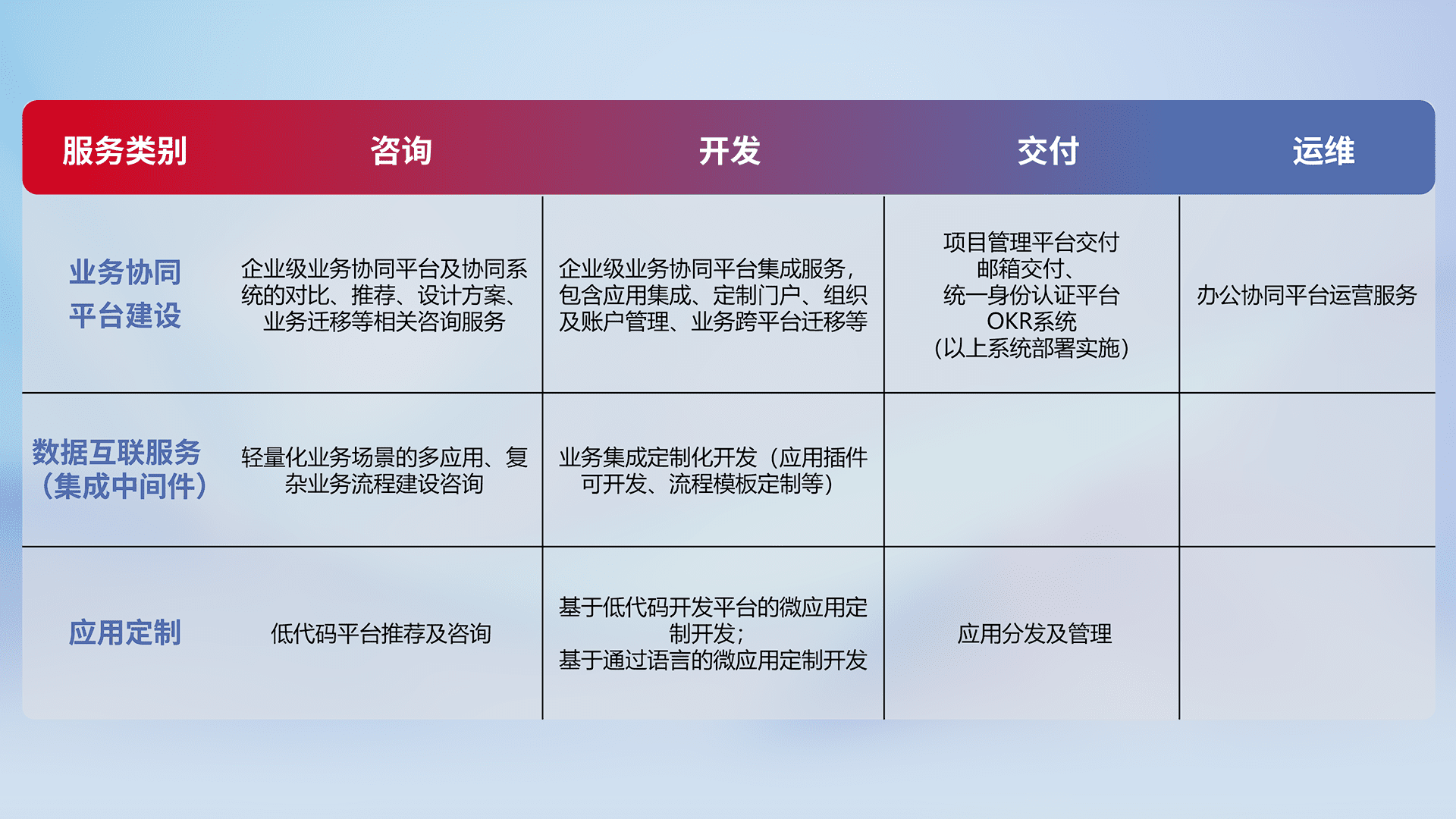 针对钉钉、、、企微、、、IDaas等平台级产品提供产品的规划、、、方案、、、、交付、、、、定制化开发等服务,,,实现如统一协同办公、、智能客户服务、、、、混合会议管理、、、智能数据查询、、、等业务场景,,,实现数字化转型。。。