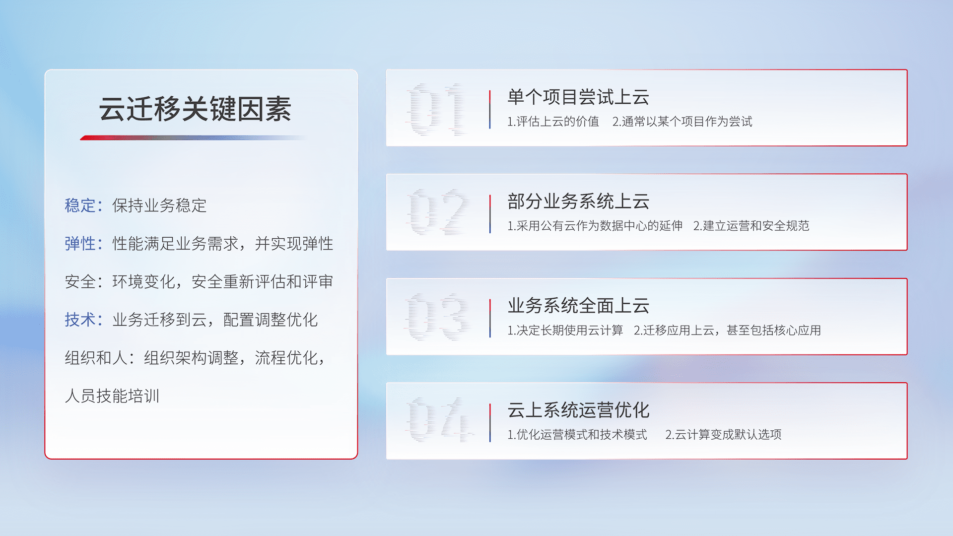 结合实际业务,,从规划设计、、、云平台选型、、、云原生改造、、、数据迁移、、、集成交付,,,迁移全过程为客户识别最佳上云路径,,,做好风险识别管理,,,,设计网络架构、、身份权限、、、安全审计合规、、、操作审计、、、日志审计、、、、监控告警策略、、多站点容灾设计等,,,,对云上基础设施进行整体规划,,,提升IT治理水平,,,以满足弹性、、、、高可用、、、、高性能的需求。。。。