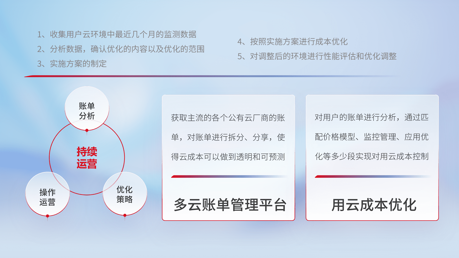 通过多云纳管,,,以统一的资源数据模型把客户的云资源进行抽象和封装,,进而实现对多云资源的统一操作,,,,保障云资源管理的可靠性、、、稳定性与可用性。。。量身定制化运维内容,,配置、、、开发运维、、、补丁管理、、备份、、、监控、、、、认证和访问管理、、审计和日常巡检等,,保障在用云过程中的可靠度,,稳定度以及高可用率。。。